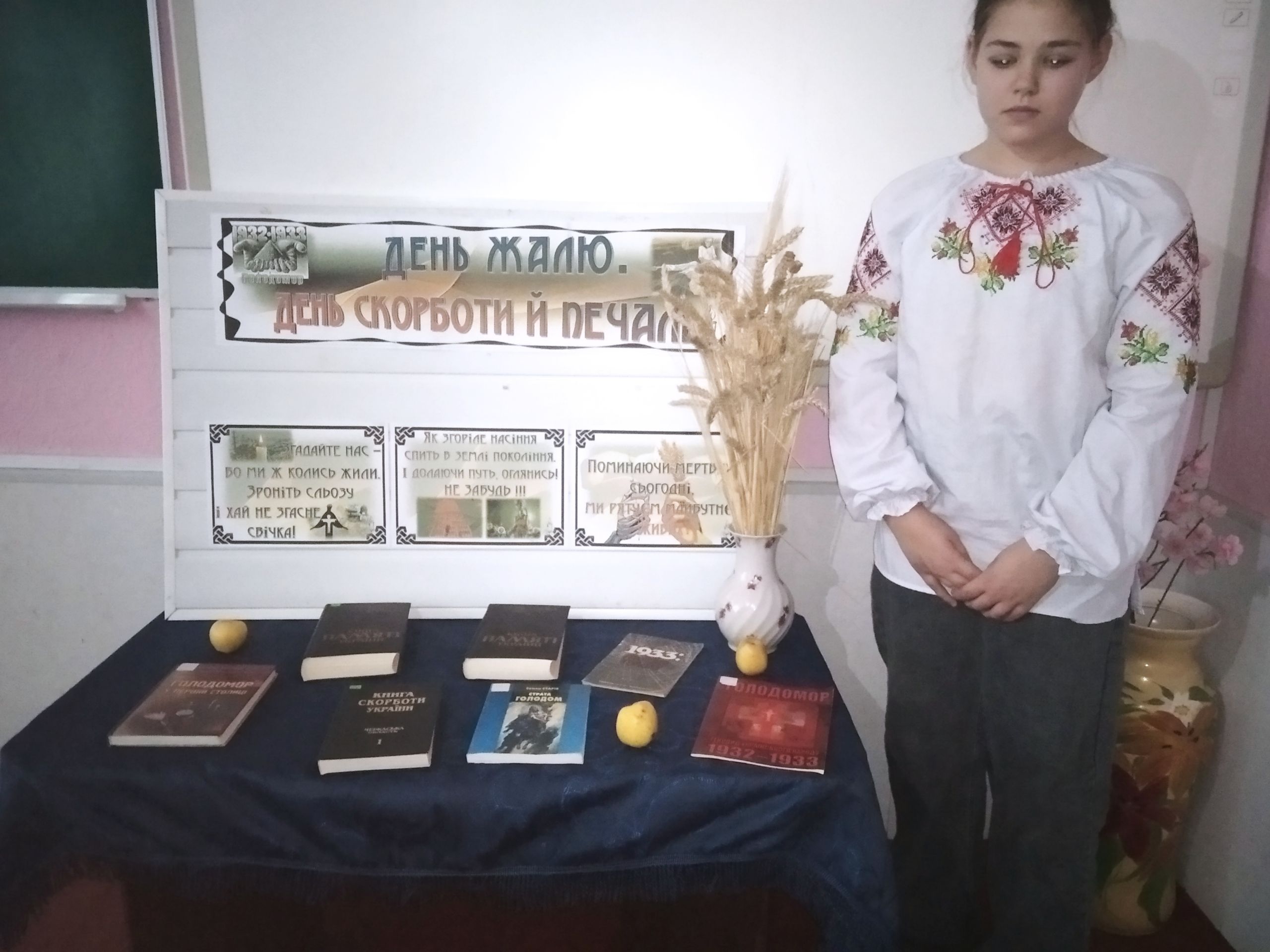 У шкільній бібліотеці була оформлена виставка пам’яті, де були представлені книжкові видання, світлини, свідчення очевидців і матеріали, що розкривають трагізм тих років. Виставка стала місцем тихого роздуму й пошани, де кожен відвідувач міг зупинитися, вдуматися і відчути глибину національного болю.